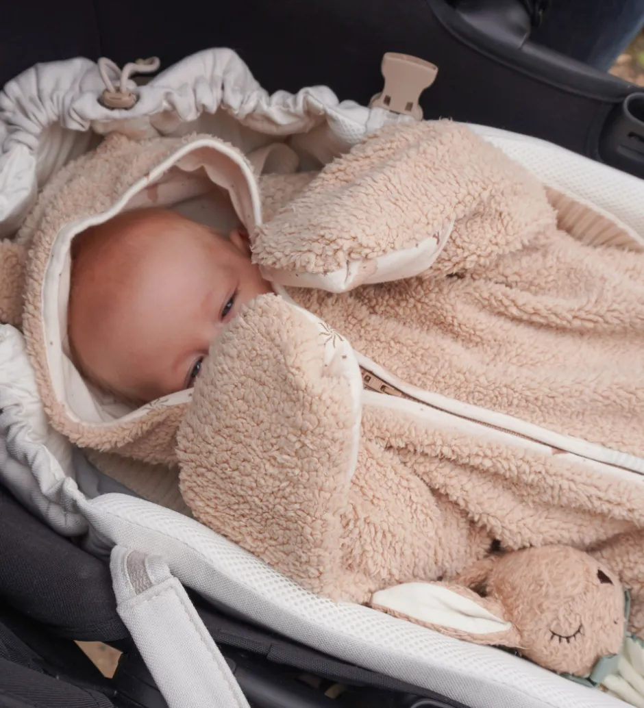 Fantastisk Cam Cam heldragt i beige teddyfleece med en hætte med søde ører. Heldragten har lynlås foran og lange ærmer og lange ben med mulighed for ombuk til lukkede hænder og fødder. Indvendigt er der hvidt tekstil med print af stjerner, skyer, drager og luftballoner i blå og brune nuancer.