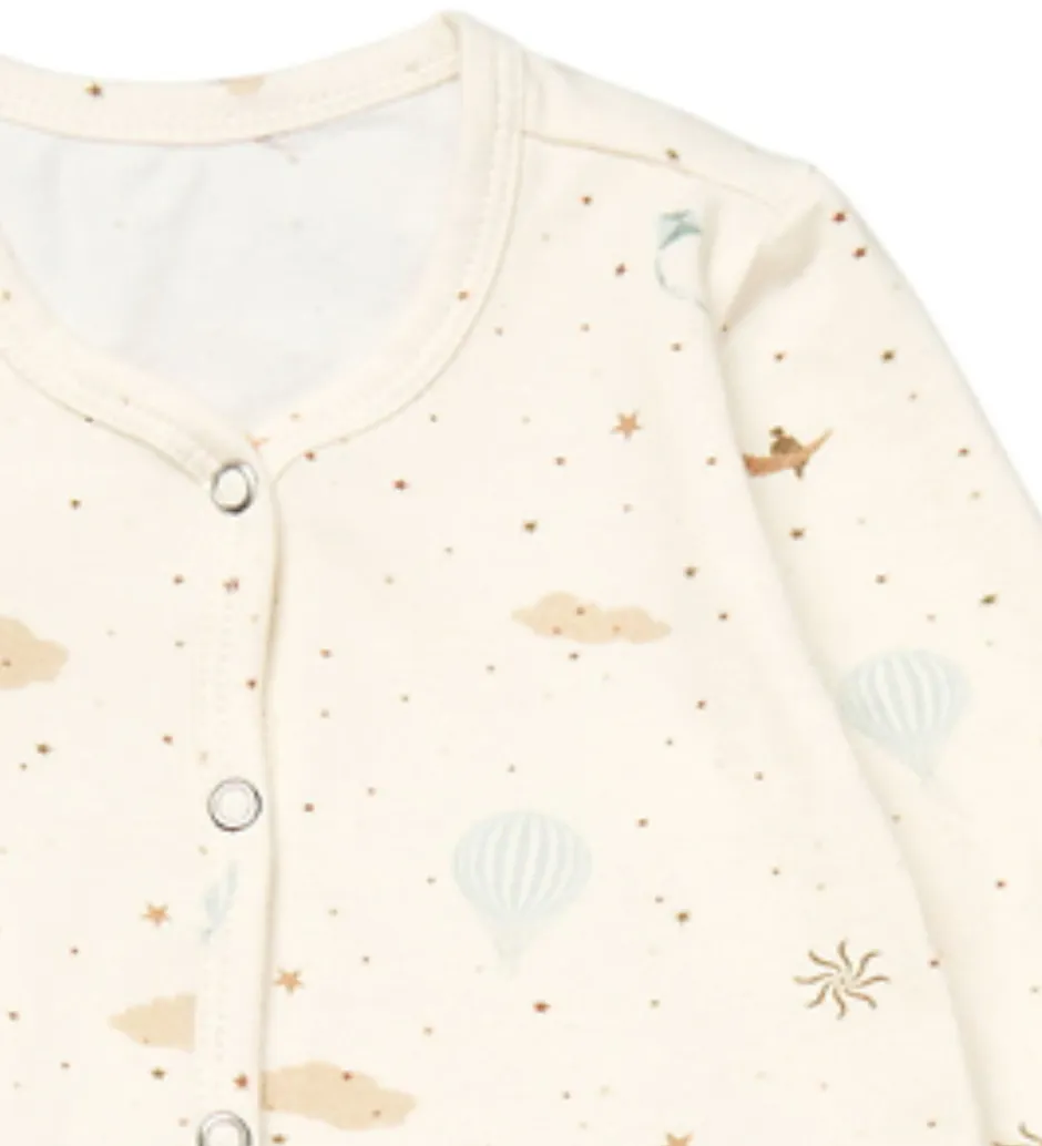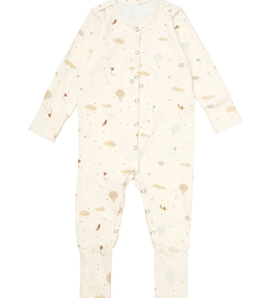 Sød Cam Cam heldragt i hvid med print af små stjerner, skyer, drager og luftballoner i blå og brune nuancer. Cam Cam heldragten har trykknapper fra hagen og ned til begge ben. Den har lange ærmer og lange ben med mulighed for ombuk til lukkede hænder og fødder.