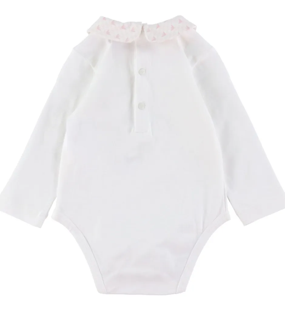 Bodyen har lange ærmer, og i halsåbningen er der en sød krave. Bodyen åbnes med trykknapper i ryggen, og mellem benene er der tre trykknapper.