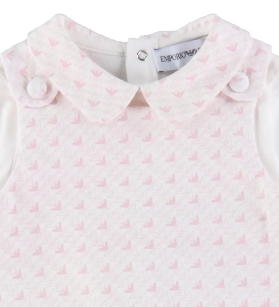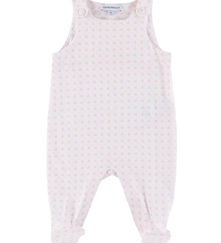 Sødt Emporio Armani sæt der består af en sparkedragt og en body. Sparkedragten er lys rosa med et alloverprint med logoer i en mørkere nuance, og bodyen er hvid, mens den på kraven har samme mønster som sparkedragten.