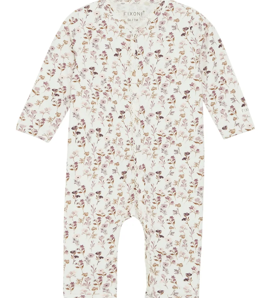 Fixoni heldragten har lange ærmer og ben med mulighed for ombuk, og den åbnes praktisk fortil med trykknapper som går ned mellem benene, og sikrer nem påklædning og ble skift.