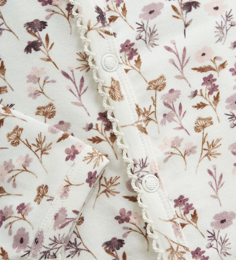 Smuk Fixoni heldragt i hvid med et delikat blomsterprint i dæmpede rosa og lilla nuancer.