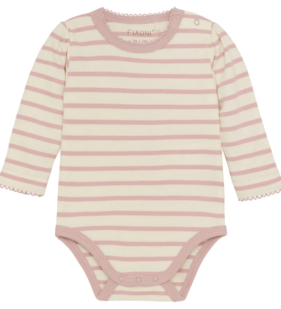 Fixoni bodyen har lange ærmer med søde pufskuldre, og i hals- og beåbningerne er der smalle ribkanter. Ærmekanterne og halsåbningen er dekoreret med fine musetakker. Bodyen åbnes ved den venstre skulder med trykknapper. Mellem benene er der tre trykknapper.