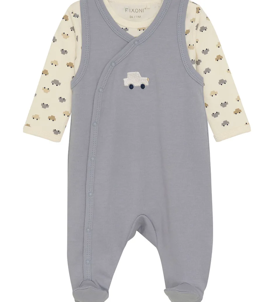 Flot Fixoni sparkedragt og body. Sparkedragten er støvet blå med en hvid bil broderet fortil, og bodyen er hvid med et alloverprint med biler i blå og brune nuancer.