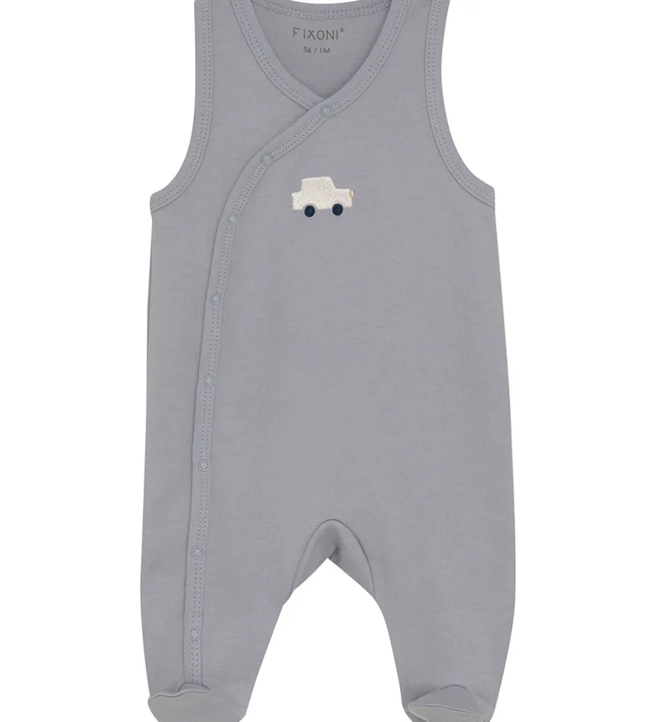 Fixoni sparkedragten har faste fødder, og den er uden ærmer. Sparkedragten åbnes med trykknapper hele vejen ned ad højre side og bukseben.