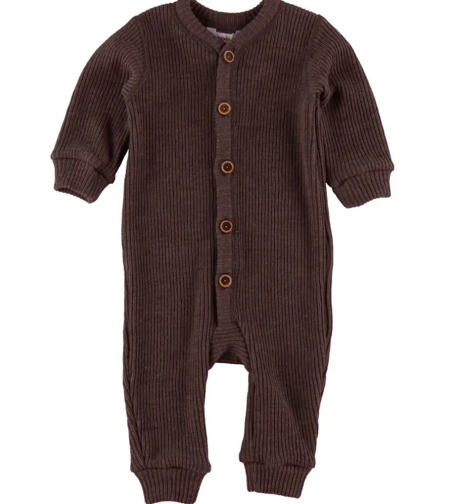 Skøn Joha heldragt i en dyb mørkebrun farve og med ribstrikket struktur. Heldragten har lange ærmer og en praktisk pasform, der giver fri bevægelighed og komfort til de små.