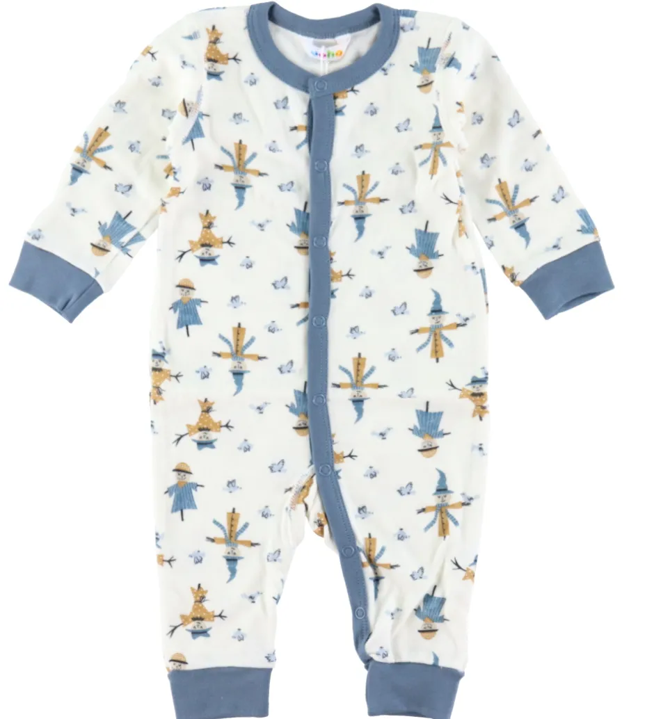 Dejlig Joha heldragt i off white, med blå kanter og forskellige fugleskræmsler i blå og brune nuancer.