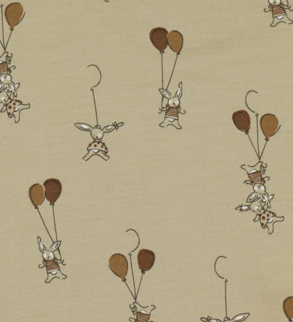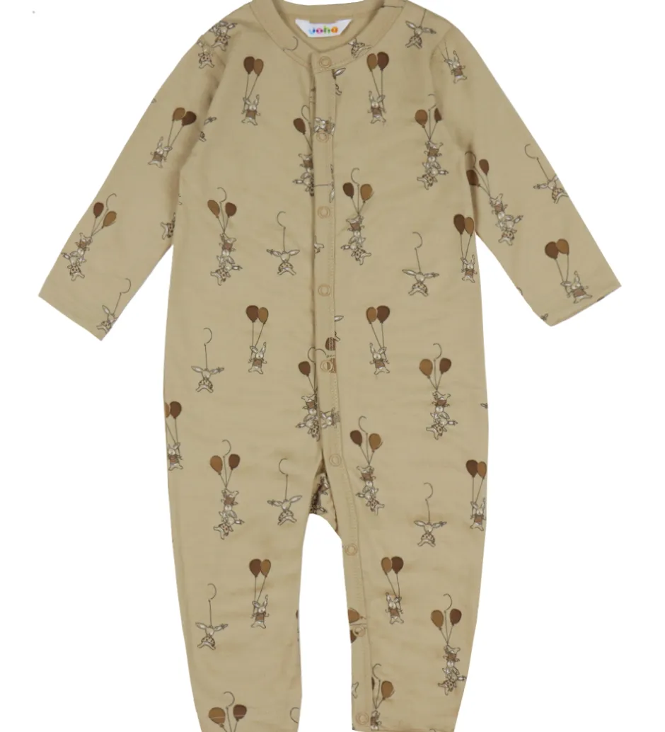 Sød Joha heldragt i beige med et charmerende print af små kaniner, der holder balloner.