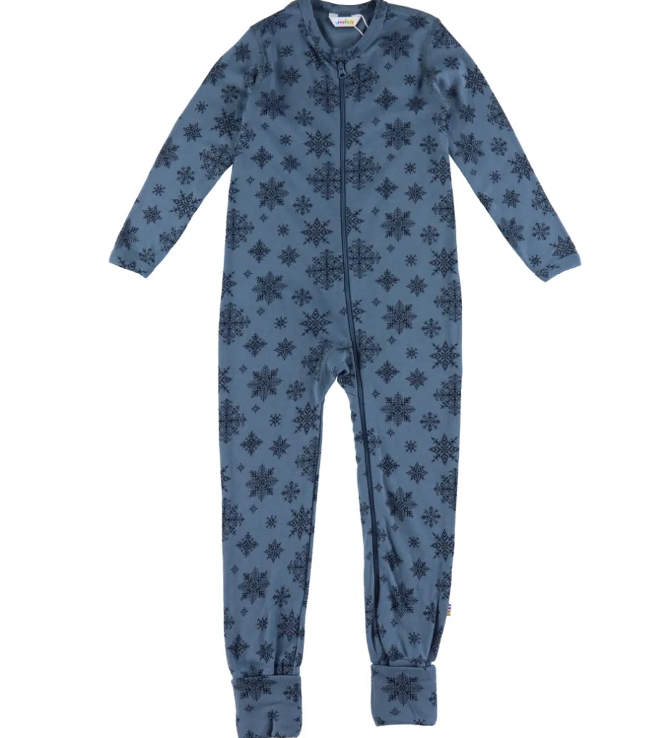 Lækker Joha heldragt i blå med fine sorte snefnug i forskellige former og størrelser.