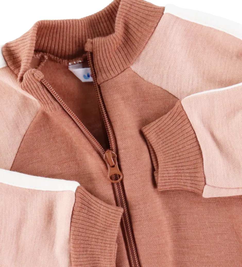 Dejlig Joha heldragt i en flot rødbrun farve med lyserøde og hvide detaljer på ærmerne.