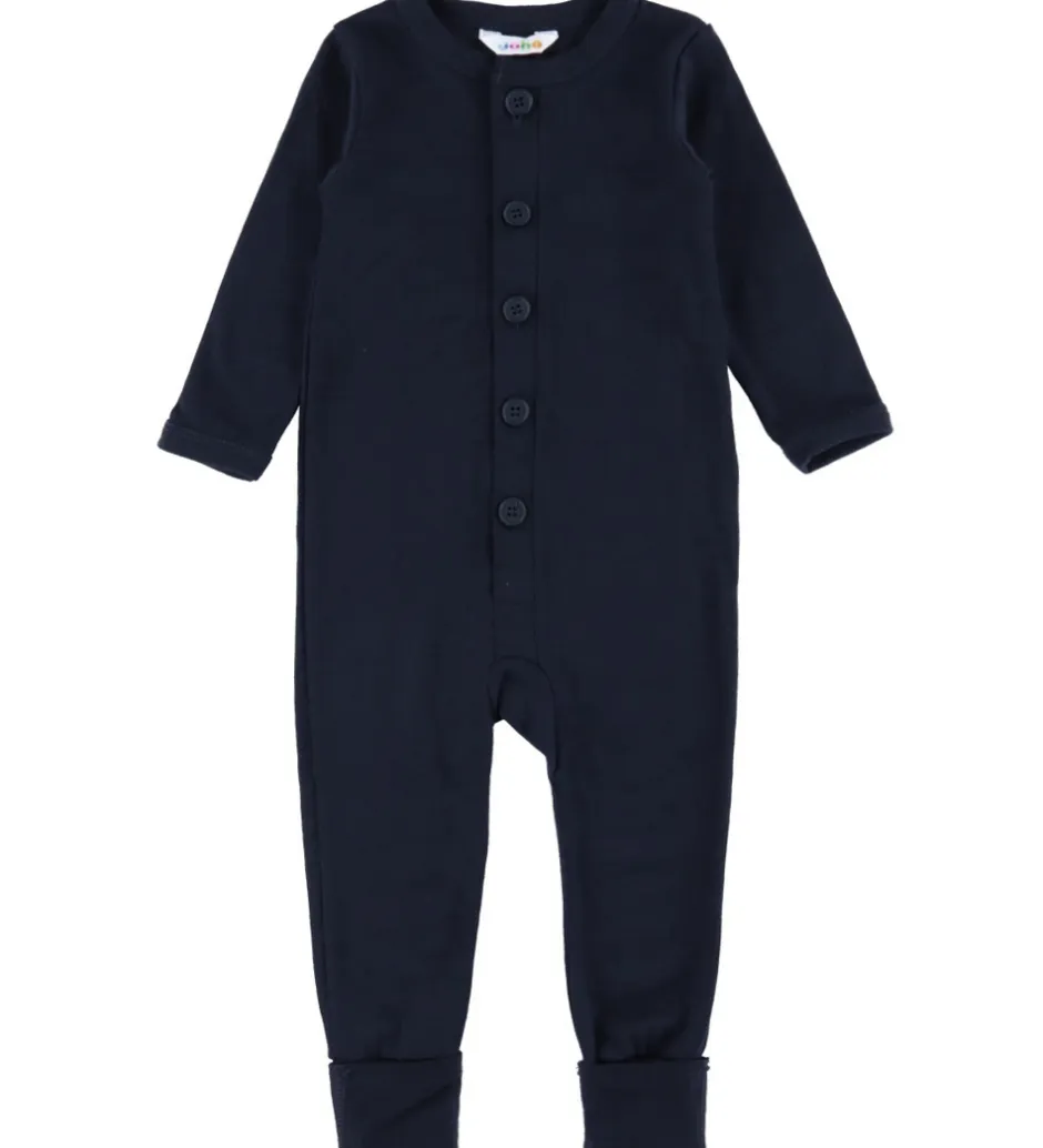 Dragten har lange ærmer og lange ben, som har ombuk til faste fødder. Foran lukkes dragten med gennemgående knapper, som gør den nem at tage af og på.