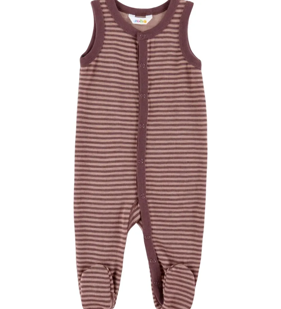 Joha sparkedragten er uden ærmer og har praktiske trykknapper langs fronten, som gør den nem at få af og på. Der er en smal ribkant ved ærme- og halsåbningen for ekstra komfort og de integrerede fødder, sørger for at små fødder holdes varme.