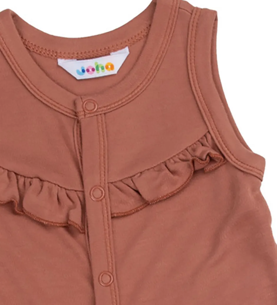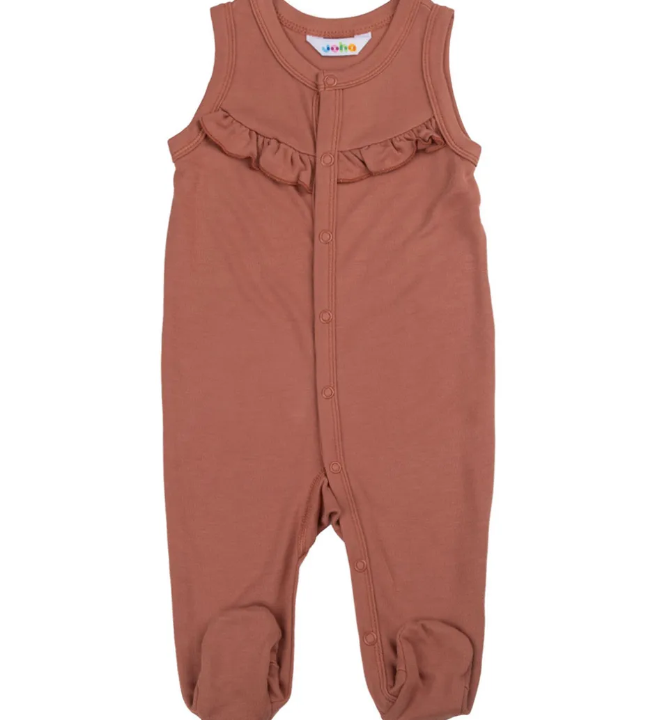 Sparkedragten er uden ærmer og har en åbning med trykknapper fra halsåbningen ned til venstre fod. sparkedragten har påsyede fødder, som varmer barnet dejligt. Joha sparkedragten er lavet i en super luftig og dejlig bambus kvalitet, der føles blød mod huden.