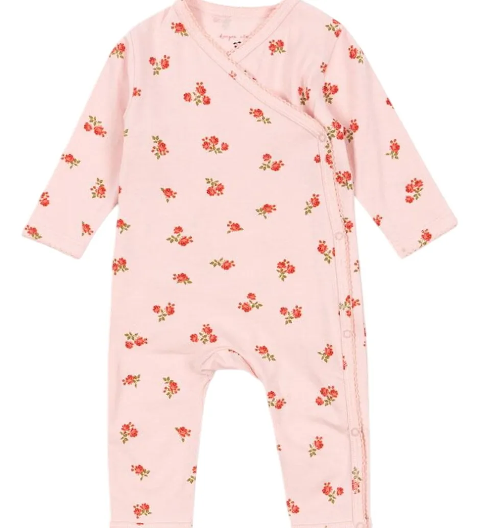 Fin Konges Sløjd heldragt i lyserød med et delikat blomsterprint i røde nuancer. Konges Sløjd heldragten har lange ærmer og ben, samt en praktisk asymmetrisk lukning med trykknapper fra halsen og ned langs siden.