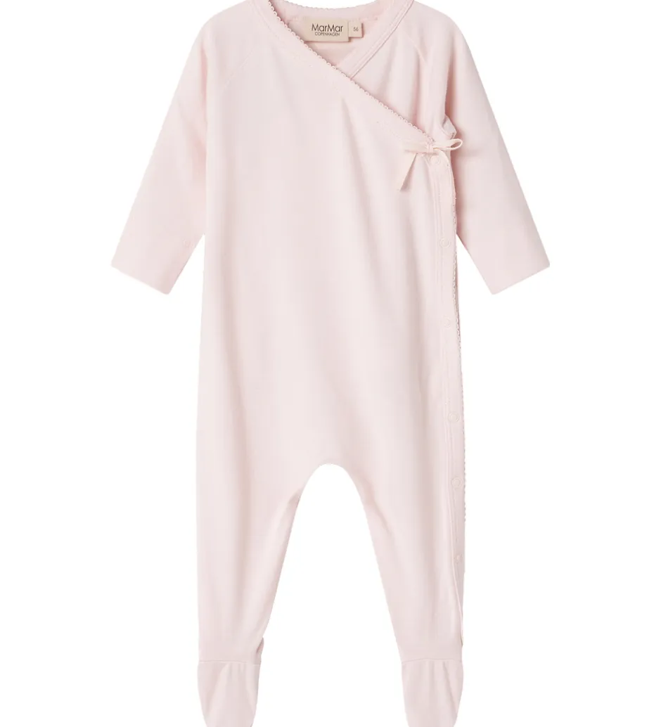 Heldragten har lange ærmer og ben med faste fødder. MarMar heldragten lukkes med praktiske trykknapper og en fin sløjfedetalje på fronten. Heldragtens asymmetriske lukning tilføjer et særligt touch til det enkle design.