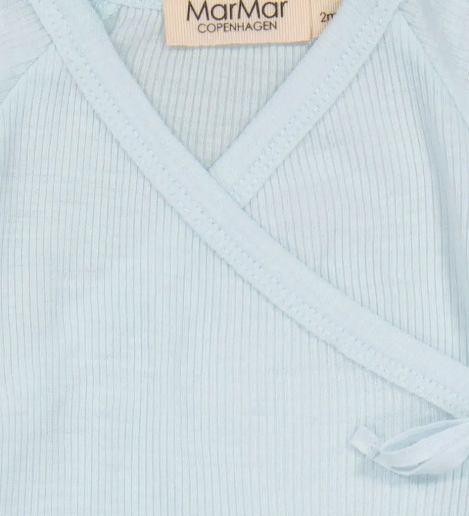 Elegant MarMar heldragt i en lyseblå farve med en struktureret overflade. Designet er enkelt og klassisk, med lange ærmer og ben.