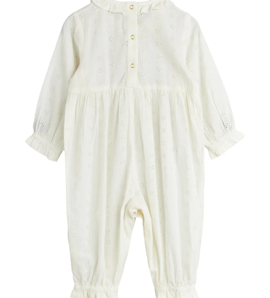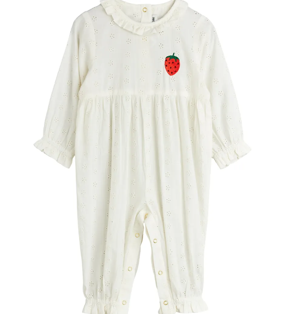 Skøn Mini Rodini heldragt i hvid med små broderede blomster og en flot jordbærapplikation.
