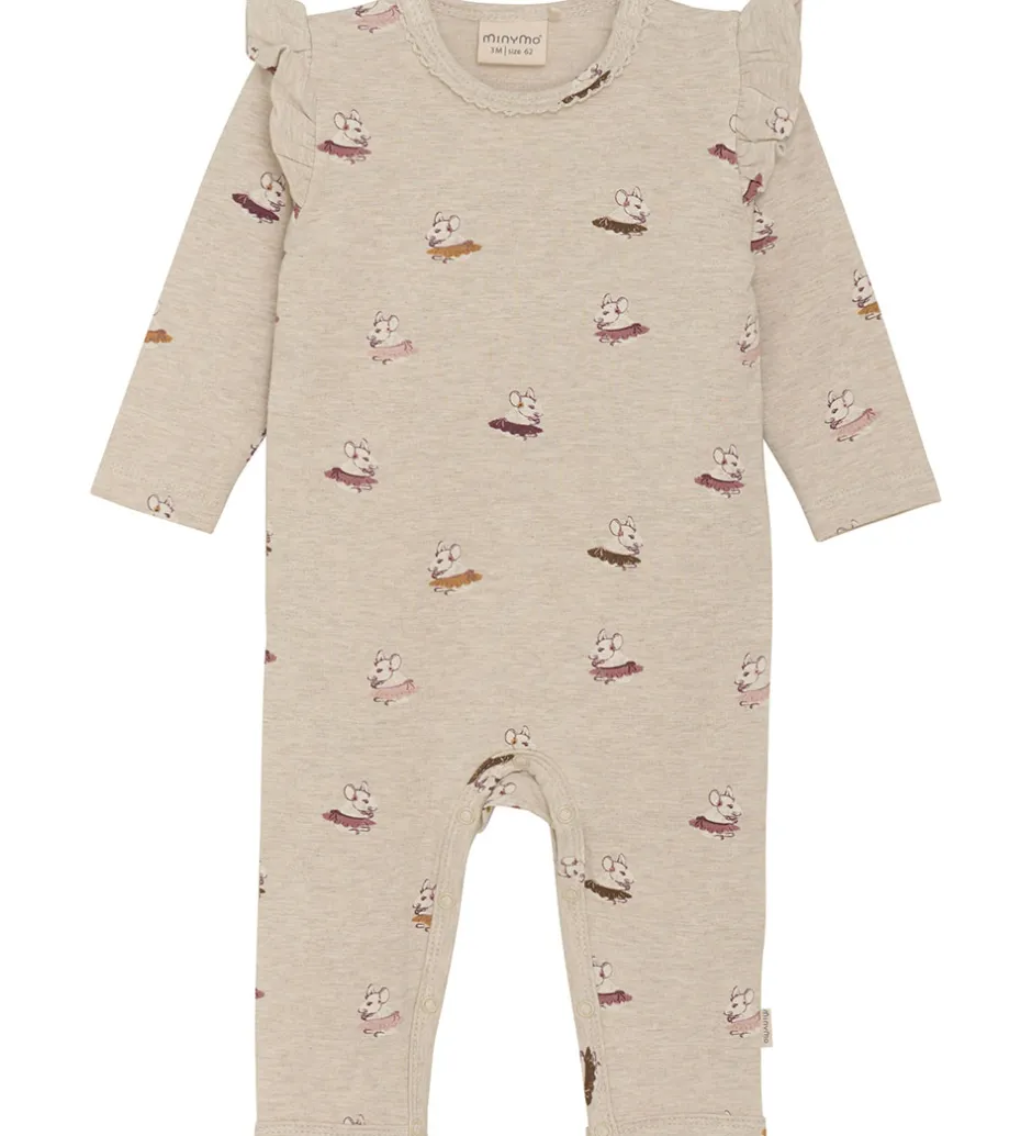 Denne skønne heldragt fra Minymo med lange ærmer er perfekt til leg og afslapning. Den er prydet med et dejligt print af små mus, der skaber en sjov og livlig stil. Minymo’s heldragt har fine flæser ved skuldrene, som tilføjer et sødt touch til dit barn’s outfit. Den komfortable pasform gør det til et ideelt valg til hverdagens eventyr.