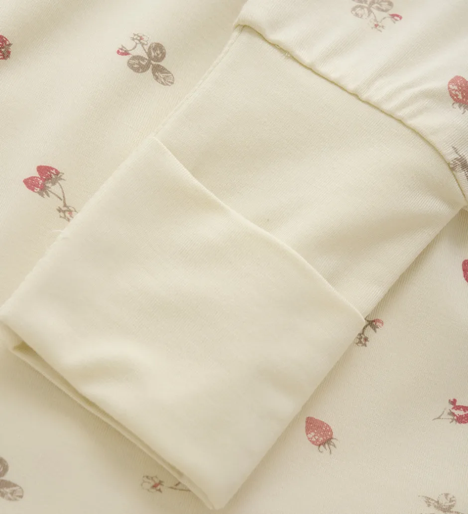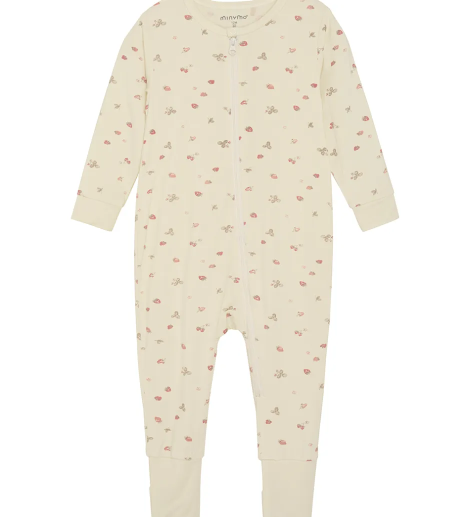 Skøn Minymo heldragt i cremehvid med et fint allover jordbærprint i rød og beige.
