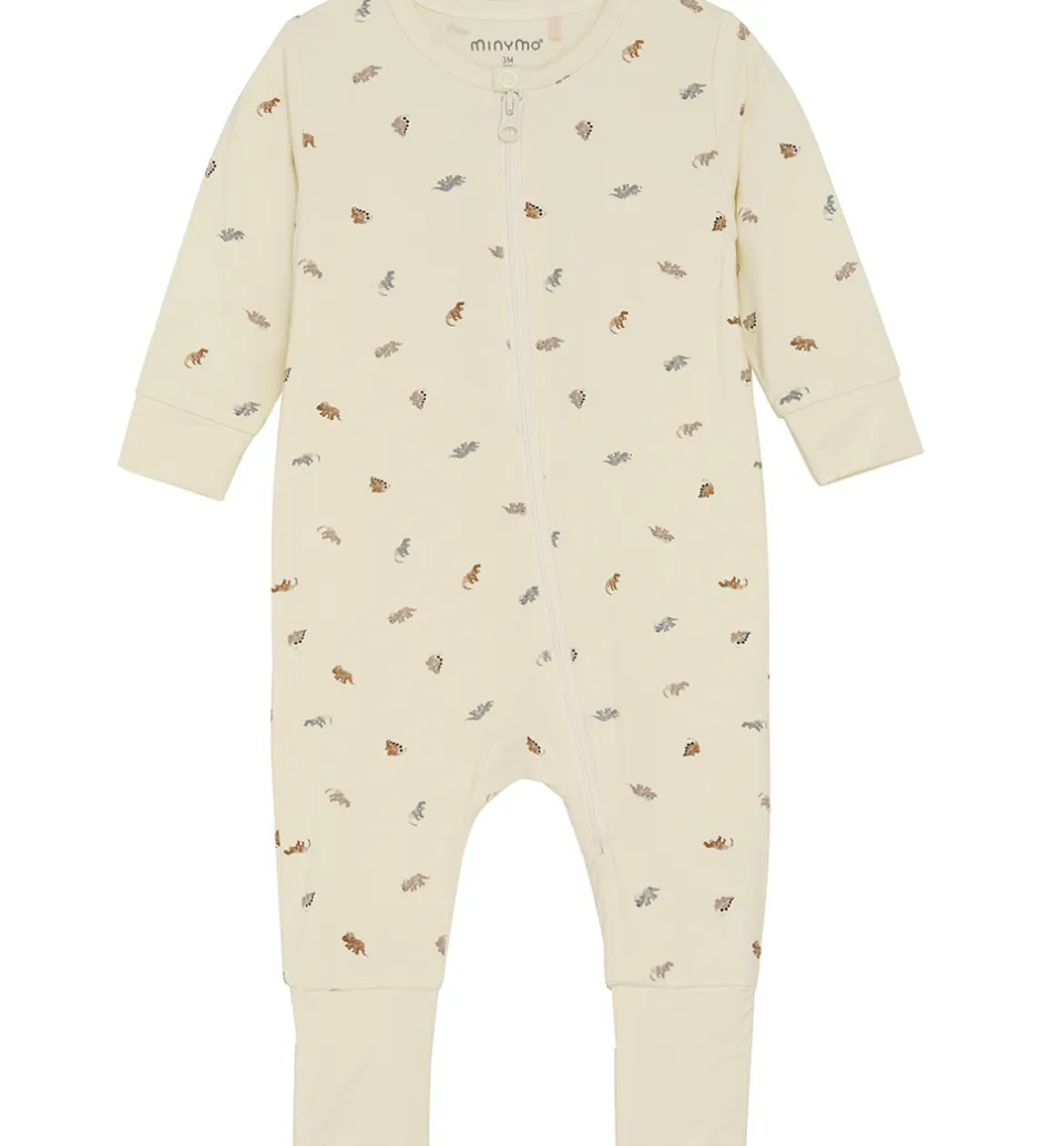 Skøn Minymo heldragt i cremehvid med et fint allover dinosaurerprint i grå, beige og brun.