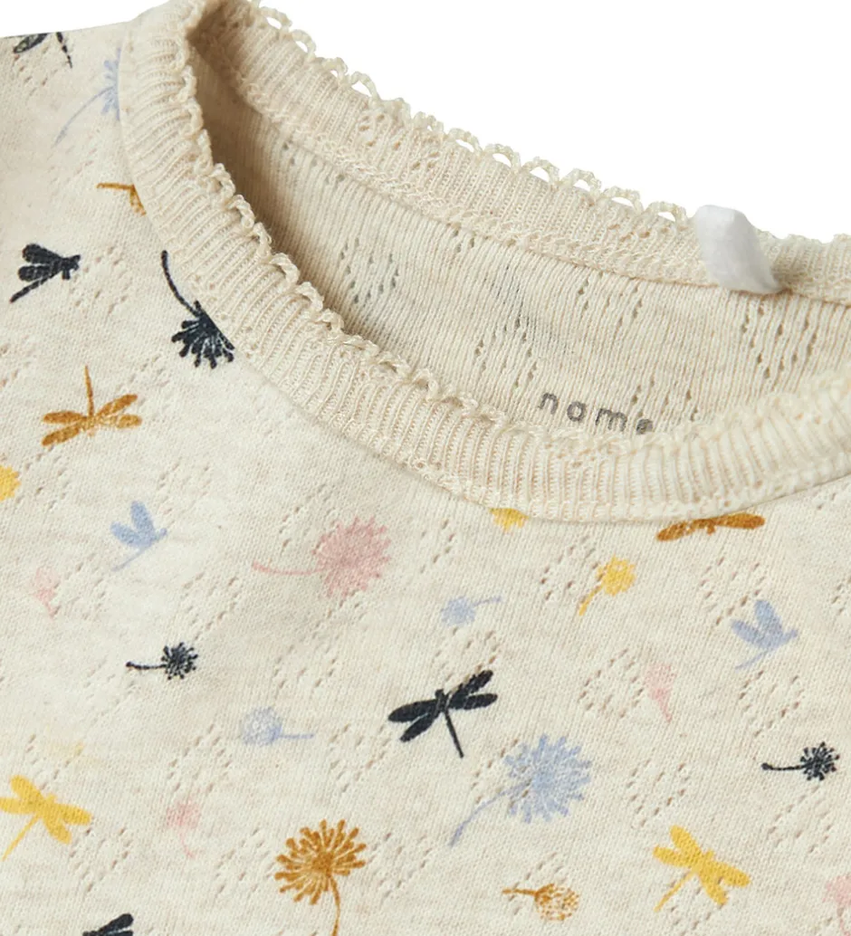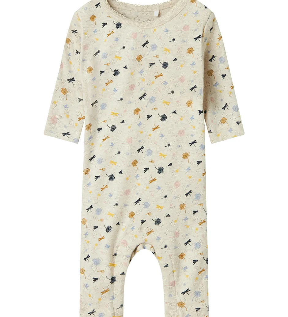Charmerende Name It heldragt i meleret beige, med hjerteformet hulmønster og et detaljeret print af blomster og insekter over det hele.