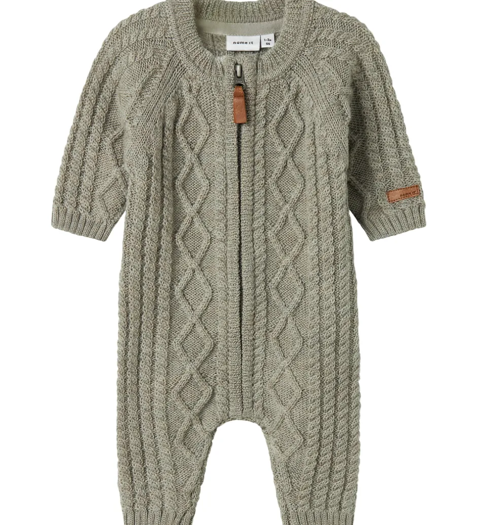 Elegant Name It heldragt i en støvet, grøn nuance med et klassisk, flettet strikmønster. Heldragten har en blød struktur og er designet med lange ærmer og ben.