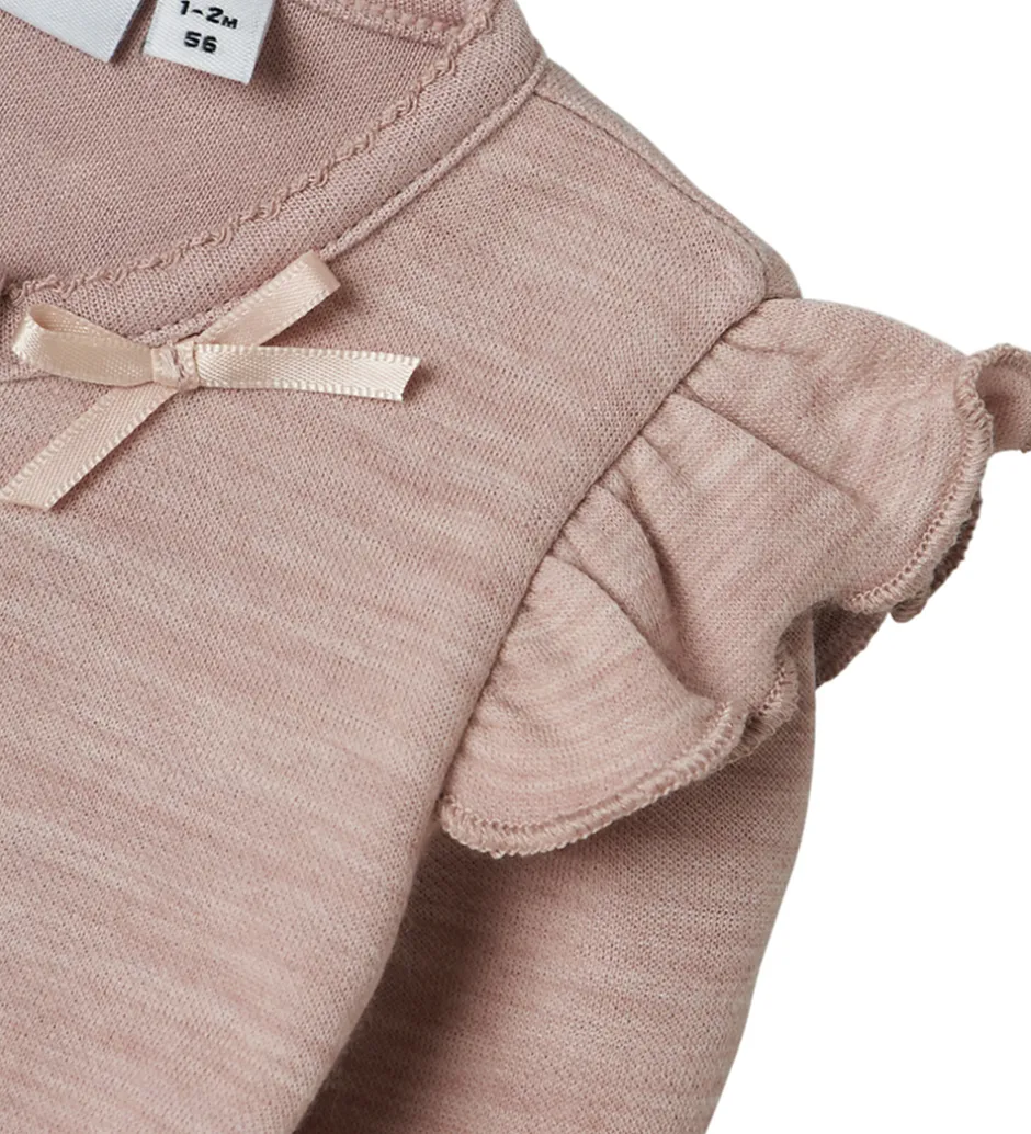 Flot Name It heldragt i meleret rosa med en sløjfedetalje foran. Heldragten har en rund halsudskæring med en fin blondekant, og lukkes foran med en lynlås med hagebeskytter. Den har lange ærmer med flæsedetaljer ved skuldrene og blondekanter i ærmeåbningerne. Heldragten har lange ben med mulighed for ombuk til lukkede fødder.
