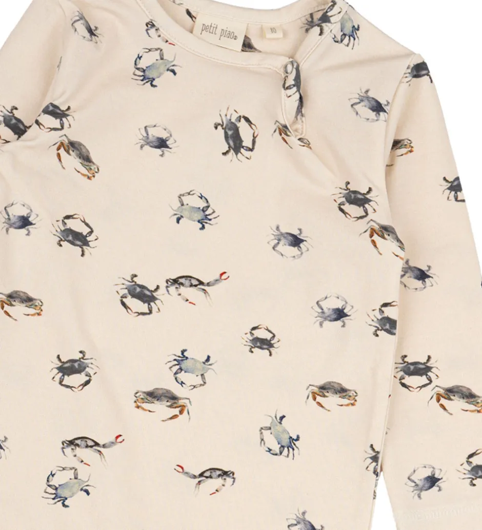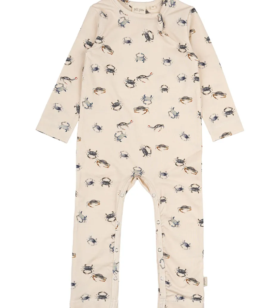 Lækker Petit Piao heldragt i beige med et alloverprint af krabber. Heldragten har lange ærmer og ben, og den åbnes med en trykknap ved venstre skulder, samt mellem benene.