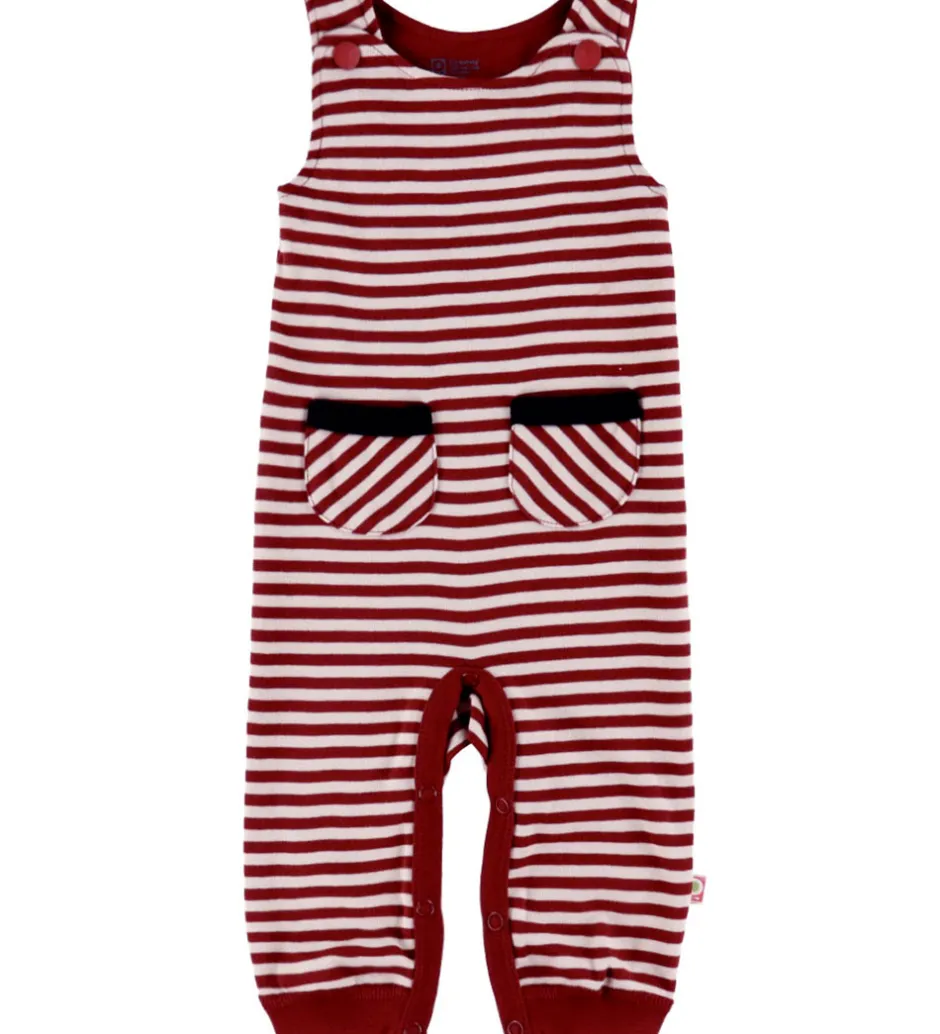 Skøn Katvig sparkedragt med vandrette striber i rød og hvid. Foran er der to praktiske lommer med en navyblå kant øverst. Katvig sparkedragten har brede skulderstropper, som sættes fast foran med trykknapper. Den har lange ben med trykknapper mellem benene.