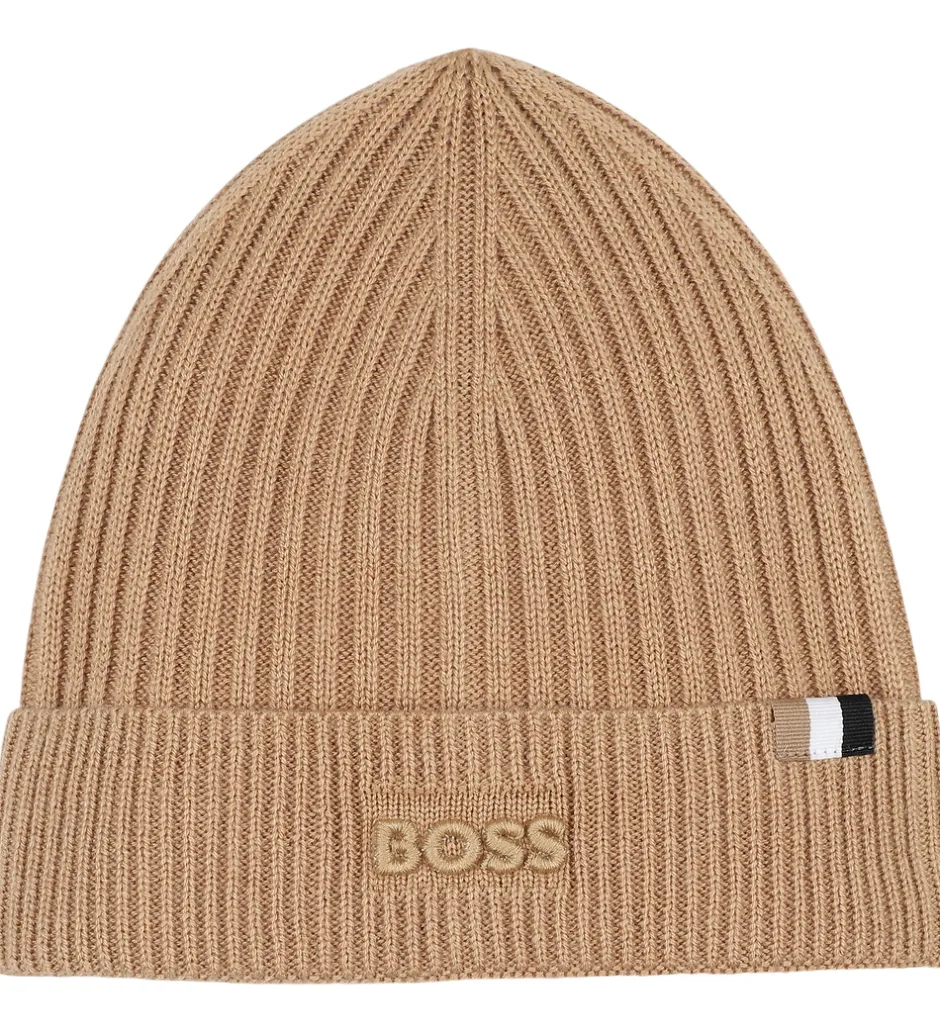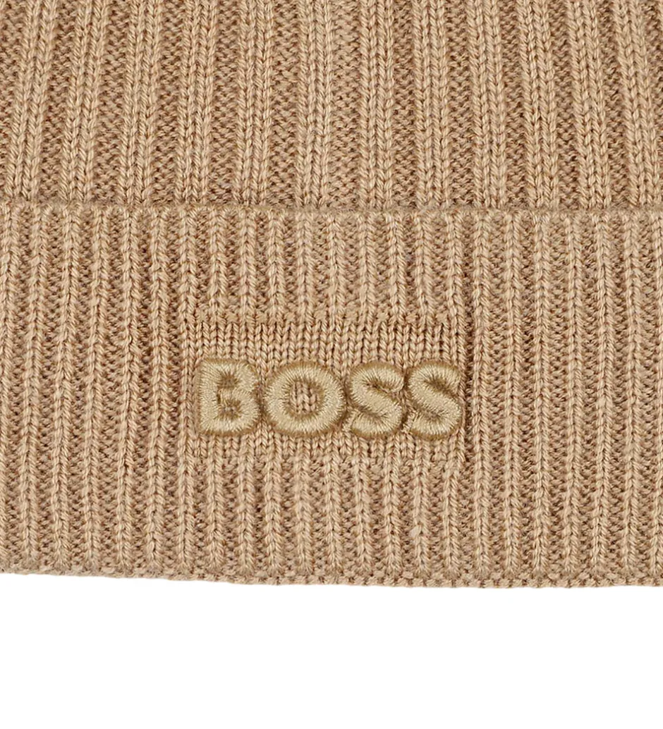 Elegant BOSS hue i ensfarvet beige i en let strikket kvalitet med ribstruktur. Huen prydes af et diskret BOSS logo broderet på fronten. Huen har en rund hovedform og et bredt ombuk langs kanten.