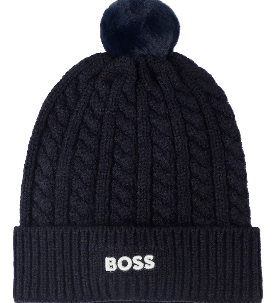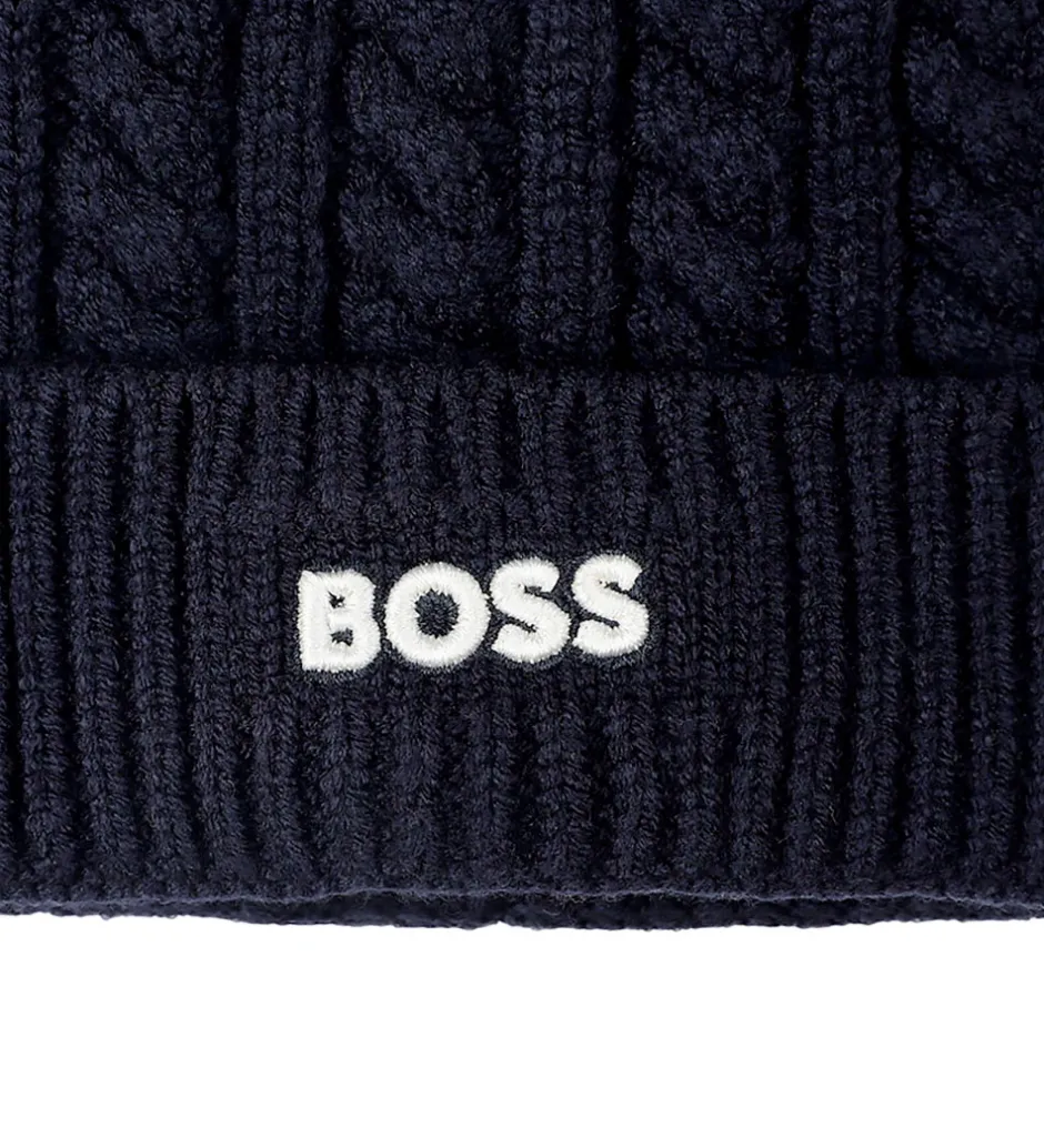 Flot BOSS hue i navy i en strikket kvalitet og med ribstruktur. Huen har en pompon på toppen, der tilføjer et stilfuldt præg.Fortil står der “Boss” broderet i hvid. Huen har en spids form, og den består af et enkelt lag med et ombuk langs kanten.