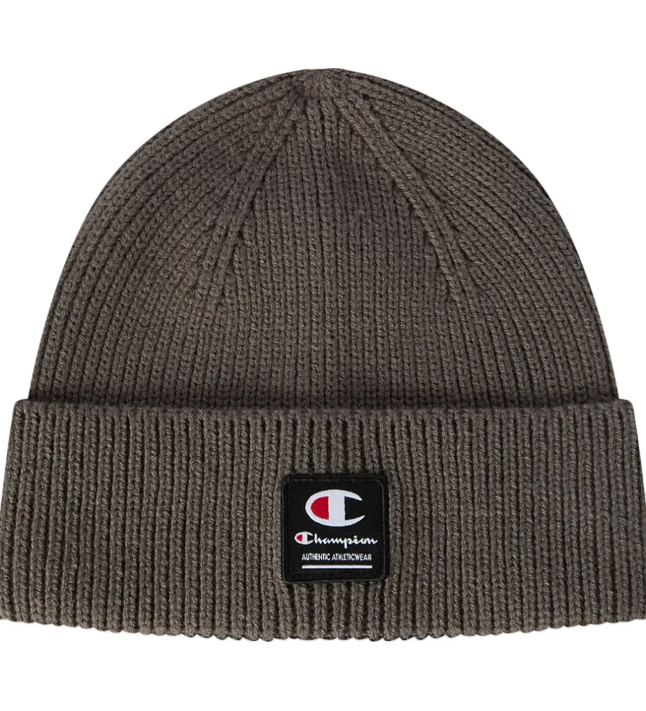 Smart Champion hue i gråbrun ribstrik med et logo på fronten. Huen har en rund hovedform med et bredt ombuk nederst.