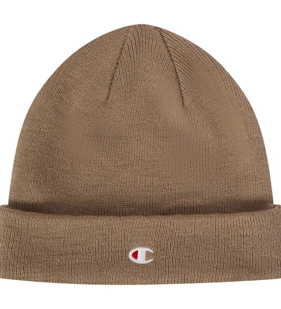 Flot Champion hue i lysebrun strik med et broderet logo i hvid og rød på fronten. Huen har en rund hovedform med et bredt ombuk nederst.