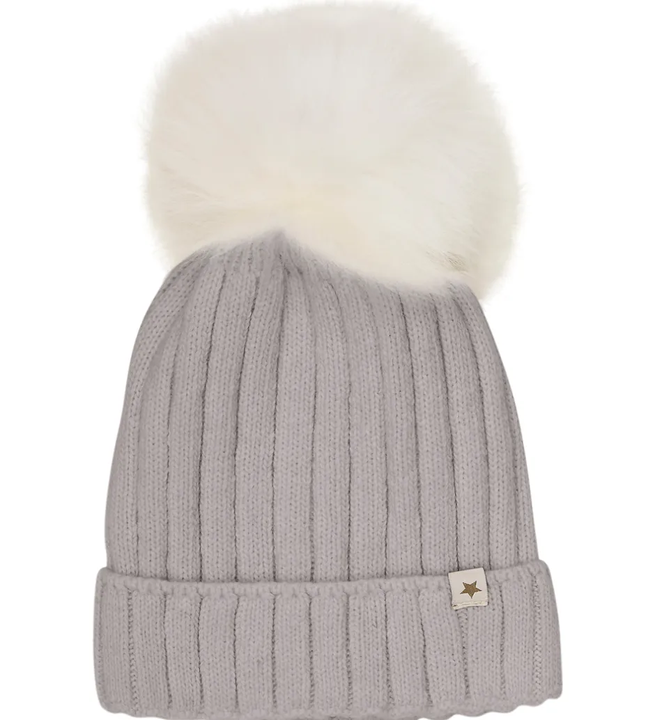Fin hue fra Huttelihut, strikket i meleret lysegrå med smuk ribstruktur. På toppen prydes huen af en stor, blød kvast i hvid, fremstillet af ægte alpakapels.