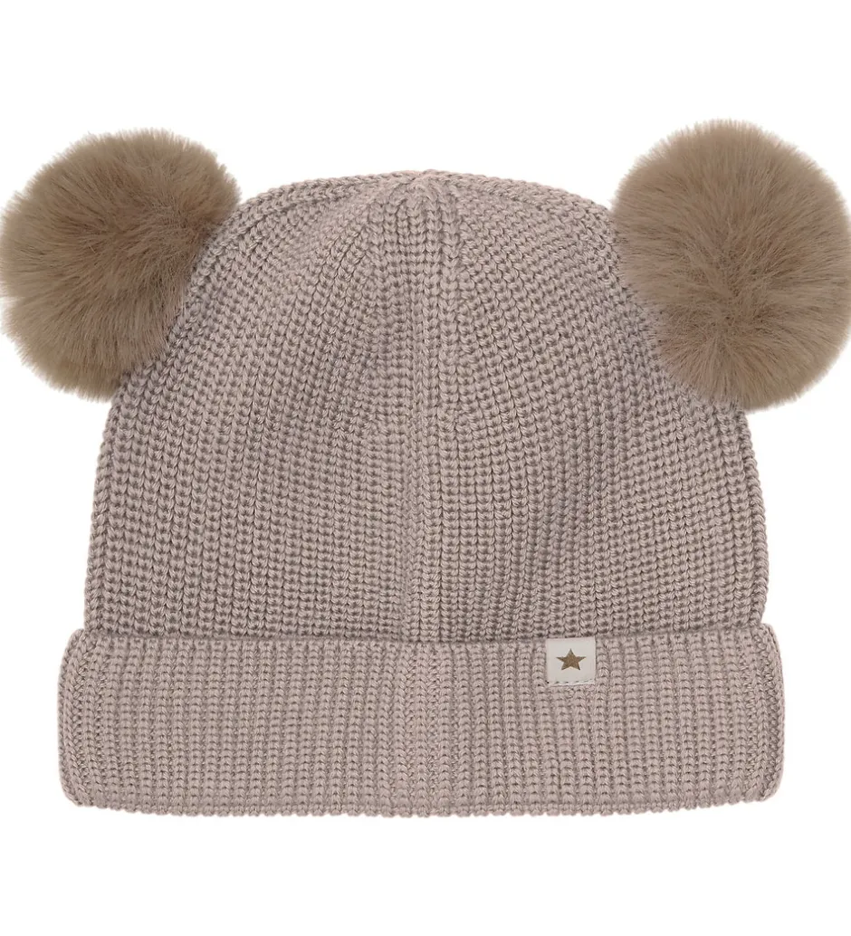 Charmerende Huttelihut hue strikket i en meleret mørkebeige med to store, bløde kvaster på toppen.