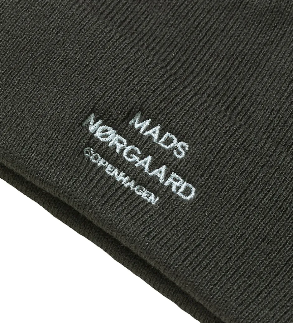 Lækker Mads Nørgaard hue i mørkegrå strik med et hvidt logo broderet fortil.