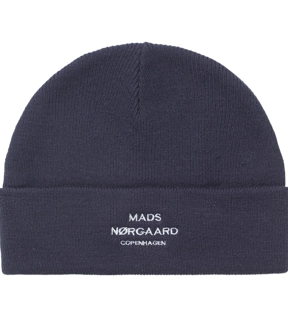 Lækker Mads Nørgaard hue i navy strik med et hvidt logo broderet fortil.