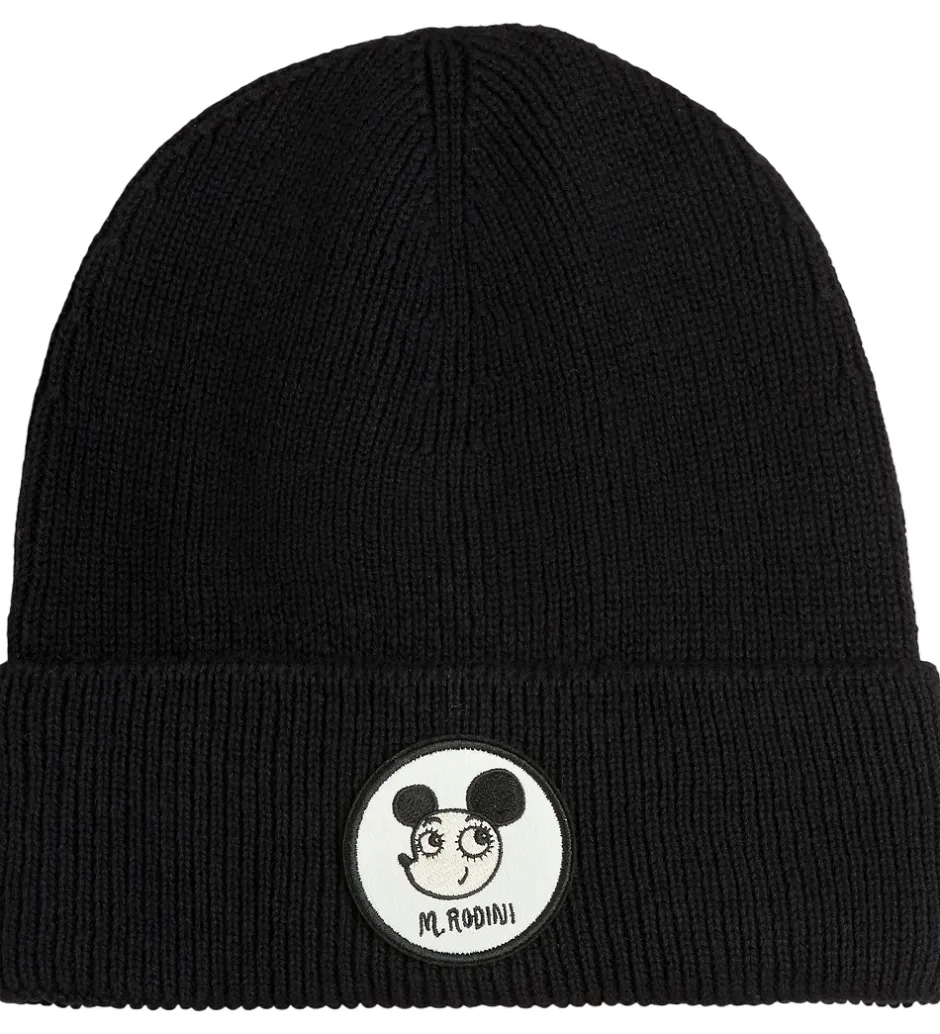 Stilfuld Mini Rodini hue i sort med en klassisk ribstrikstruktur. Huen har et dekorativt, rundt mærke foran, der viser Mini Rodinis karakteristiske design med et tegnet ansigt og teksten “M. Rodini”.