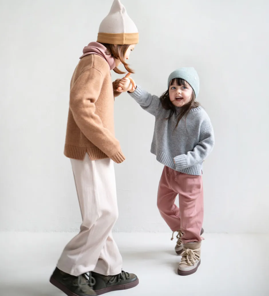 Lækker Minimalisma hue i beige i toppen og karrygul i bunden. Huen har ribstruktur, og den er lavet af blødt merinould. Minimalisma huen har en rund hovedform, og den består af to lag med et bredt ombuk i bunden.