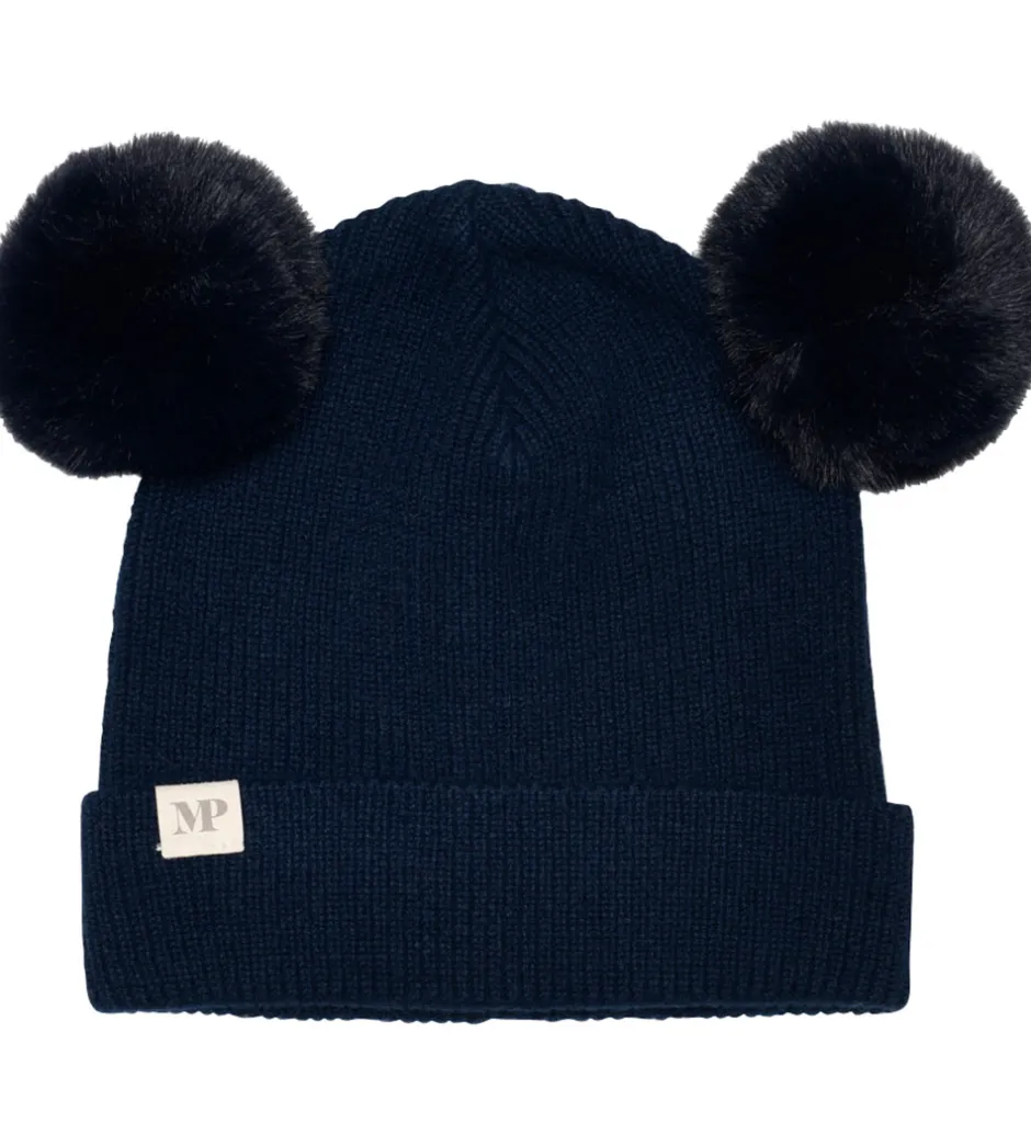 Charmerende MP hue i en dyb, marineblå farve med en blød, strikket ribstruktur. Huen er udsmykket med to stilfulde kvaste på toppen, der tilføjer et unikt touch. MP-logoet sidder diskret på kanten og fuldender designet. Huen kombinerer klassisk stil med moderne detaljer.