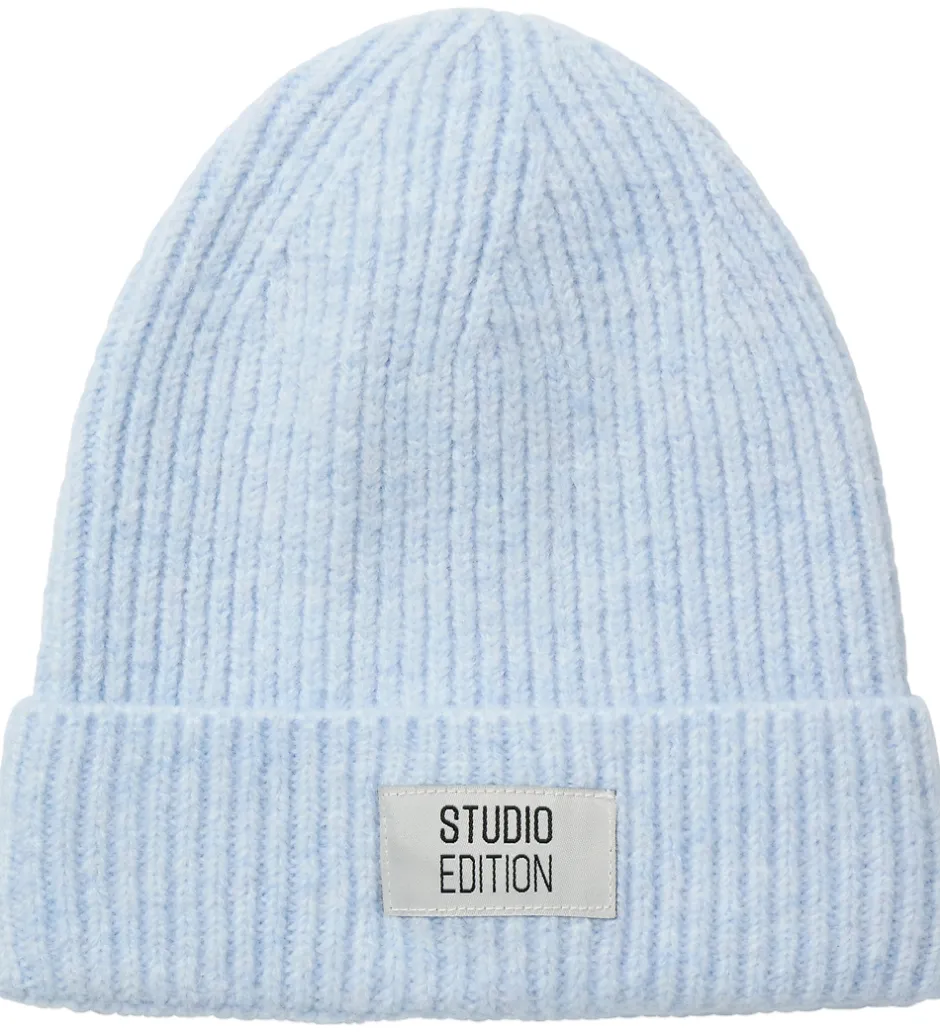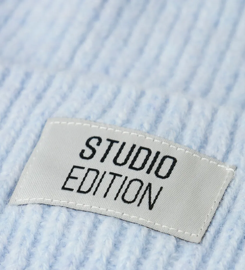 Flot Name It hue i en lys blå nuance med ribstruktur. Name It har valgt et enkelt design med et mærke på forsiden, hvor der står ‘Studio Edition’.