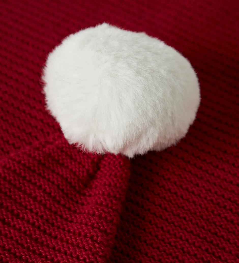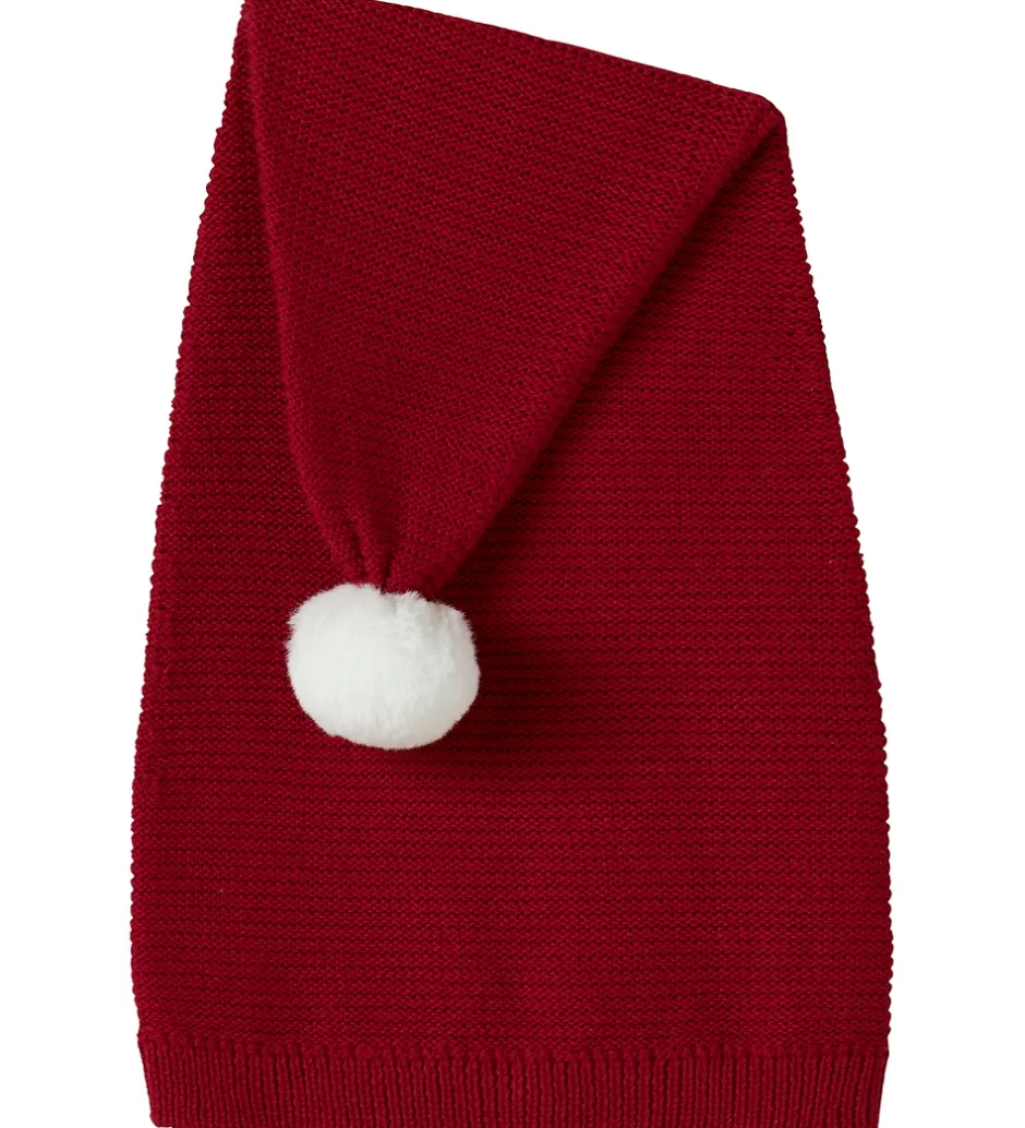 Charmerende Name It nissehue i rød med en hvid kvast på toppen. Name It nissehuen har en strikket struktur med en ribkant ved åbningen, som giver en god pasform.