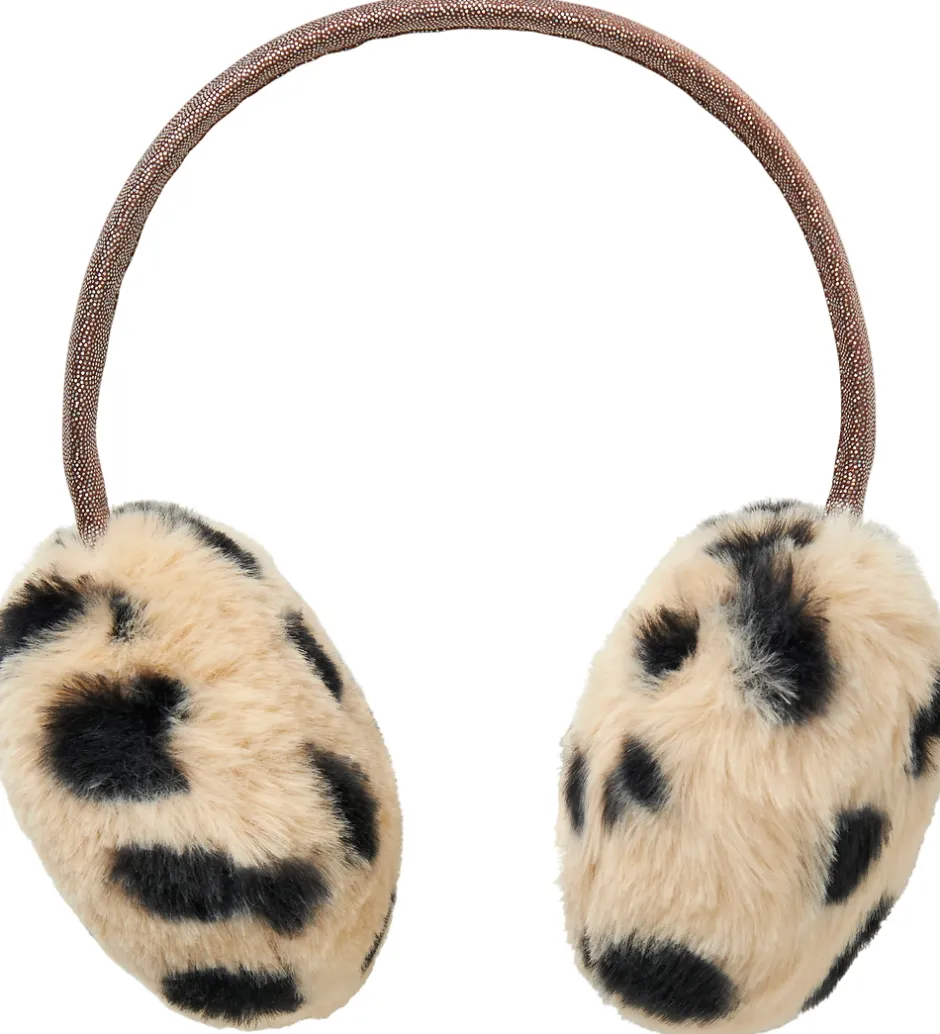 Fine Name It ørevarmere i beige plys med sorte prikker og en bue i multifarvet glimmer. Ørevarmerne har to vatterede puder med en bue imellem, så de sidder godt til på hovedet.