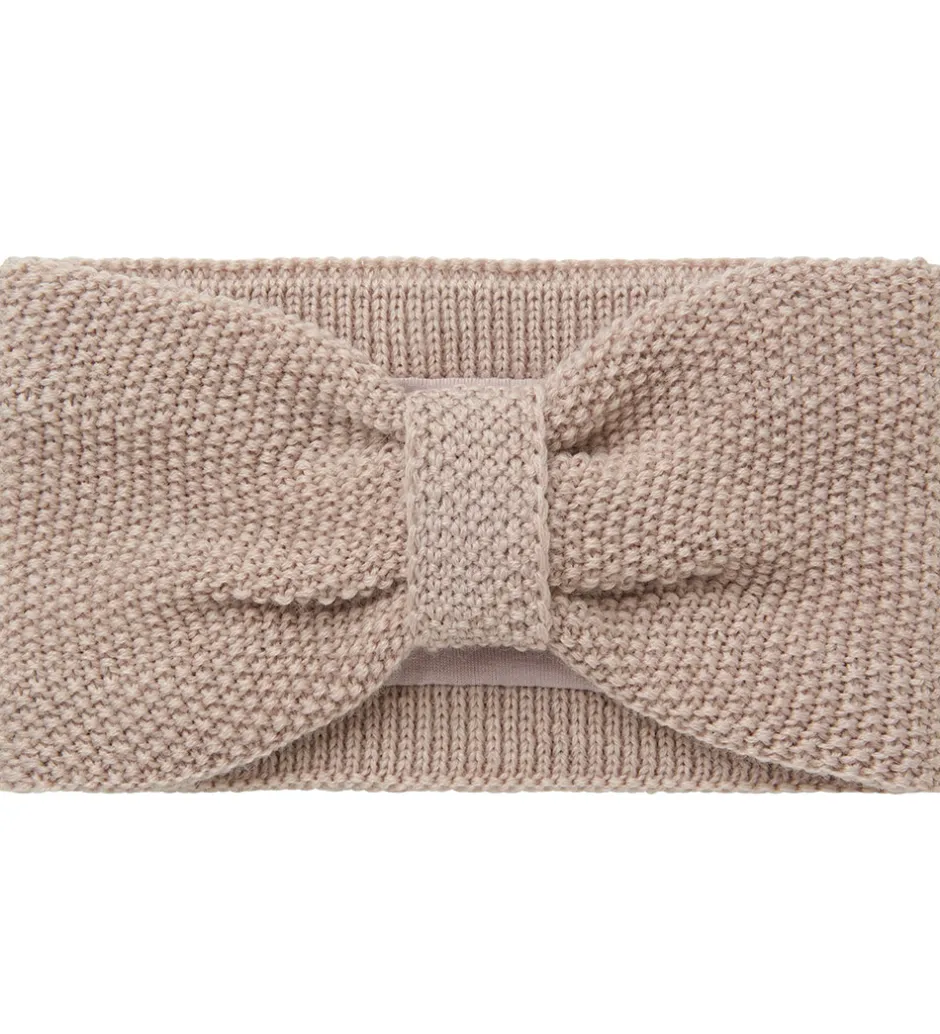 Elegant Name It pandebånd i støvet rosa med sløjfedesign. Pandebåndet har en strikket struktur og består af to lag. Inderst er der blødt bomuld, mens det yderste lag er i merinould.