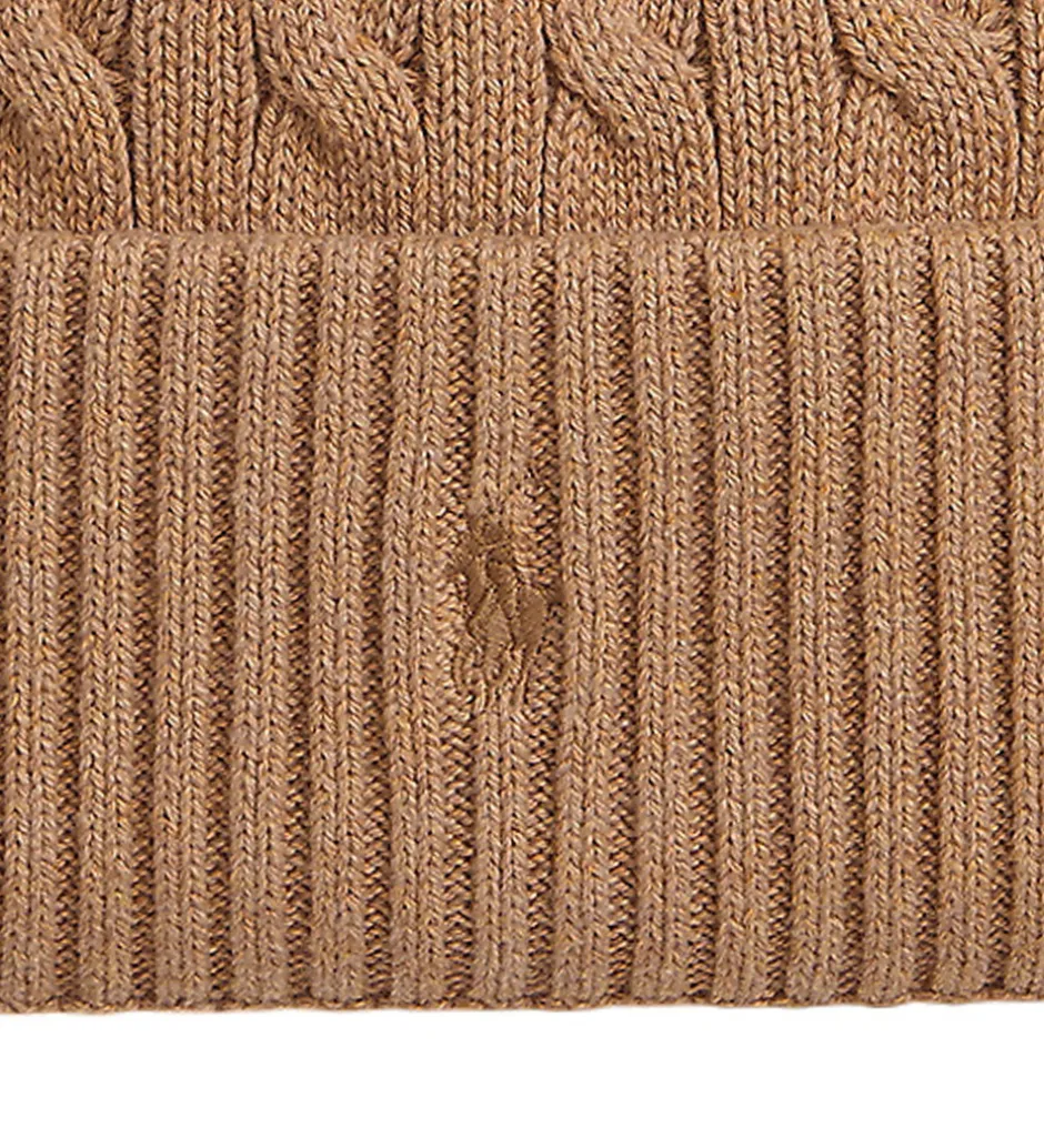 Lækker hue fra Polo Ralph Lauren i ensfarvet lysebrun i bomuldsstrik med et snoet mønster. Polo Ralph Lauren hueen har et bredt ombuk med ribstruktur, og den består af et enkelt lag. På indersiden er der langs kanten blødt fleece.