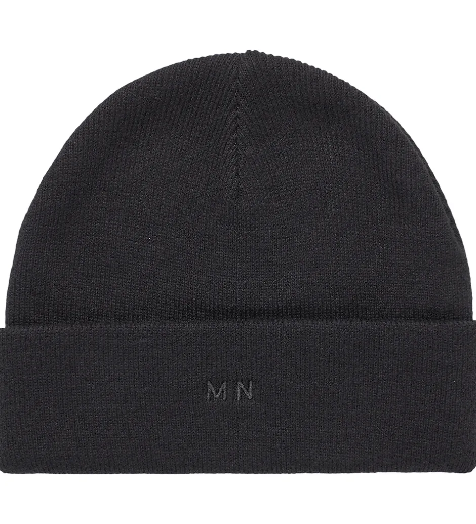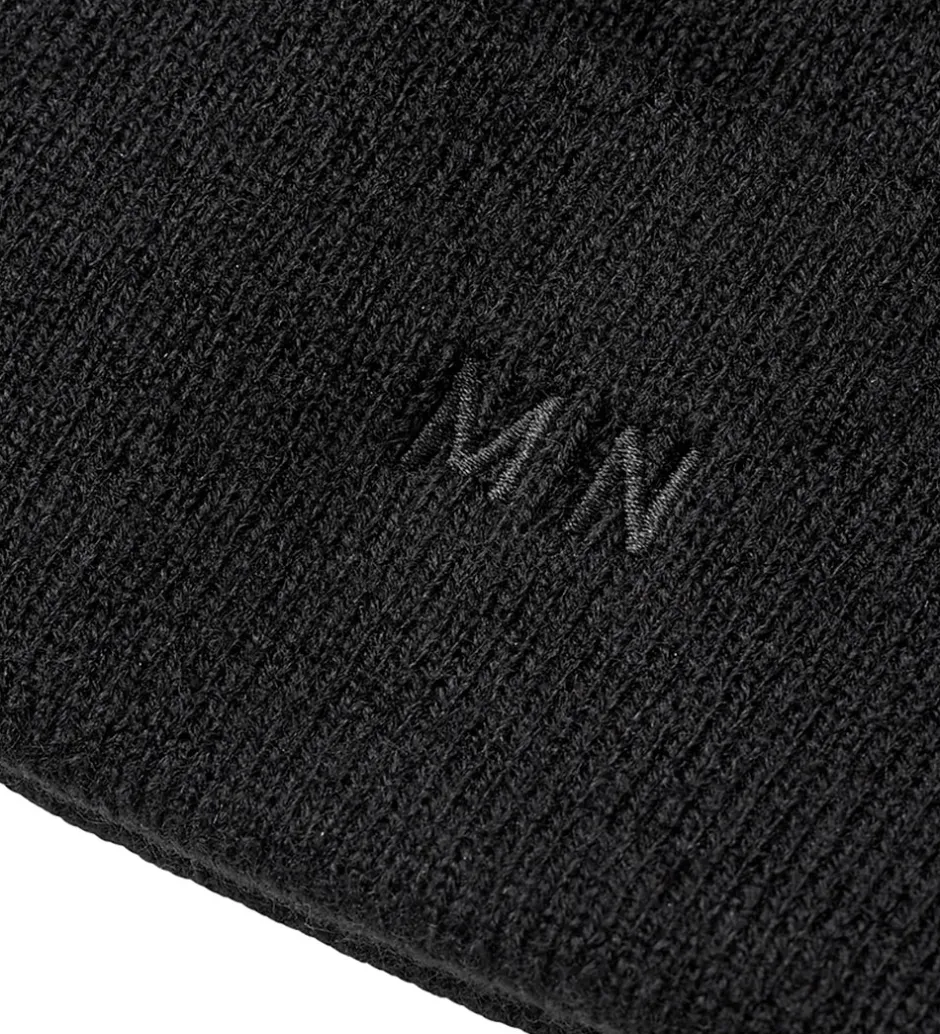Stilfuld Mads Nørgaard hue i sort strik med bogstaverne “MN” broderet i sort foran. Huen har en rund hovedform med et bredt ombuk nederst. Den består af to lag blødt akryl.