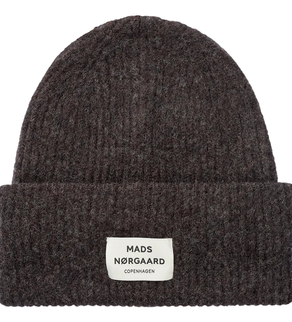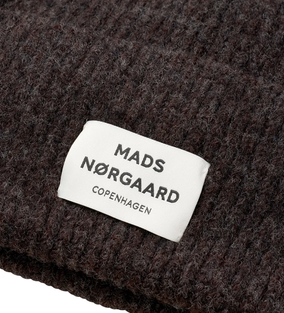 Stilfuld Mads Nørgaard hue i en dyb mørkebrun farve med ribstrikket struktur. Foran er det er stort, hvidt logo.