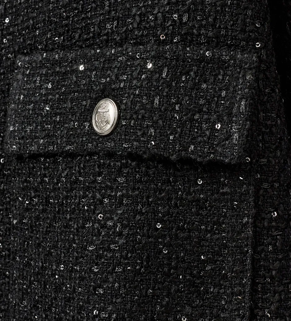 Smart Sofie Schnoor blazer i en klassisk sort farve med fine detaljer og små pailletter. Blazeren har praktiske lommer og en afslappet pasform, hvilket giver et stilrent look til enhver garderobe.