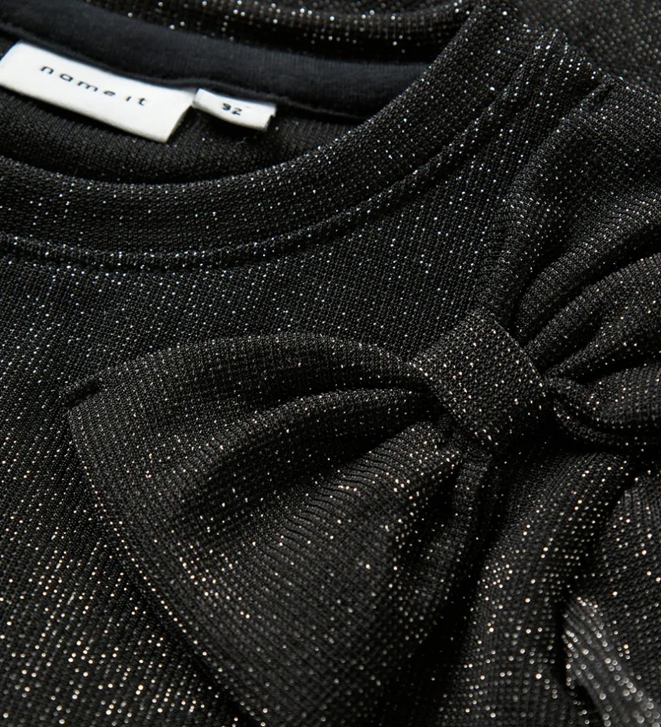 Flot Name It bluse med lange ærmer i sort med glimmer. Med en rund halsudskæring og en dekorativ sløjfe på skulderen fremstår Name It blusen både stilren og fin. De bløde ærmer har elastiske kanter.