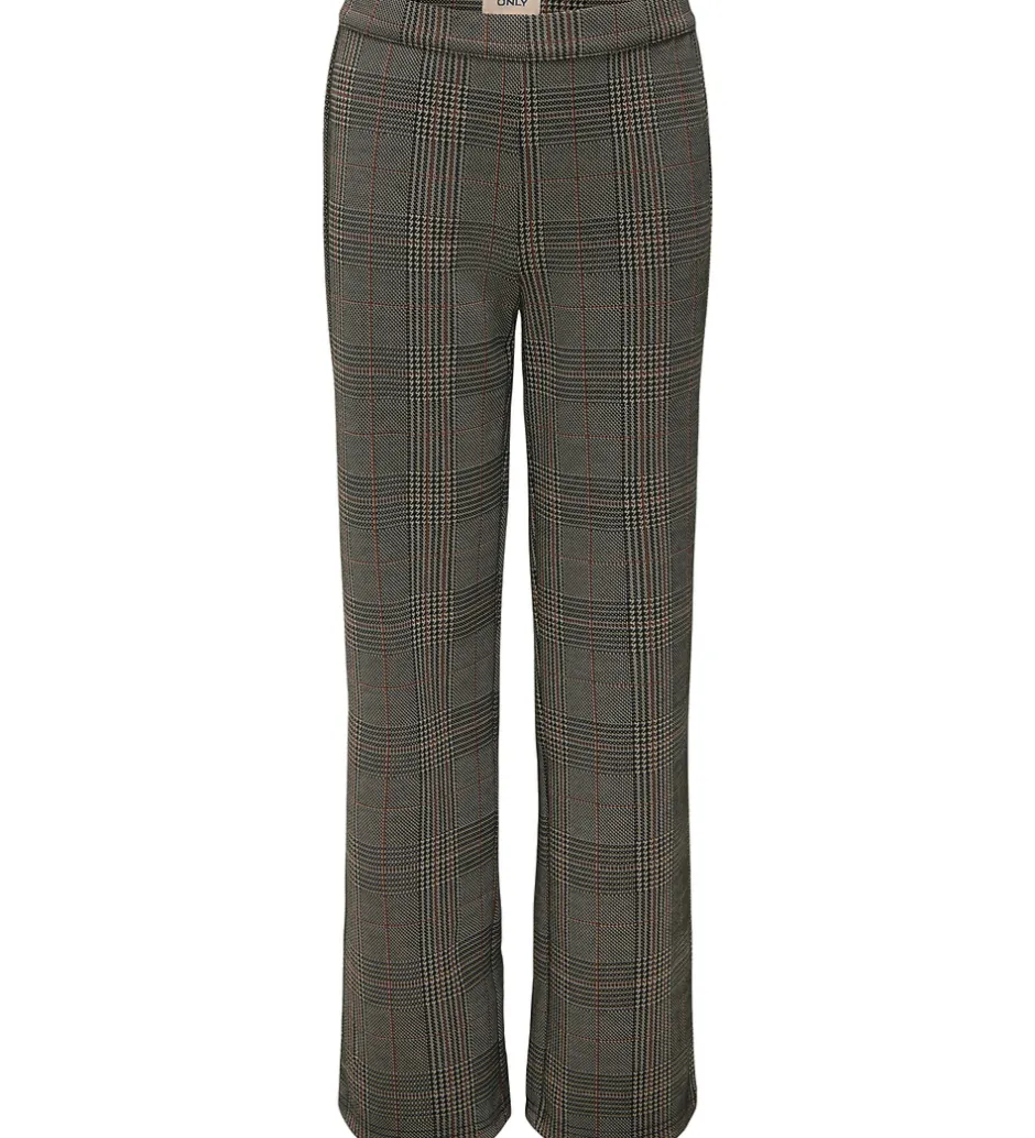 Flotte bukser fra Kids Only i et stilfuldt ternet mønster med nuancer af beige og sort, suppleret med subtile røde linjer. Kids Only bukserne præsenterer en klassisk pasform med lidt vide ben og en elastikkant.